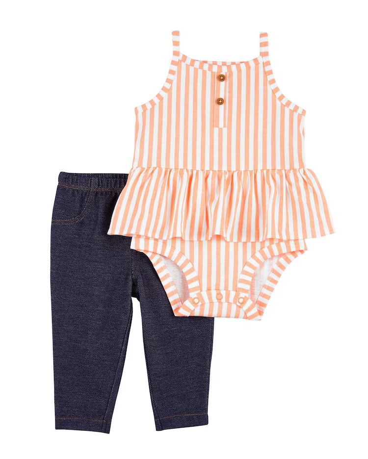 O Conjunto longo bebê 2 peças de elástico listrado multicor | Carter's é delicado e deixa sua baby ainda mais fofinha. Feito de algodão, o conjunto conta com uma calça com cós de elástico e um body listrado com babadinhos. Ideal para os papais que buscam praticidade e estilo para a sua bebê.