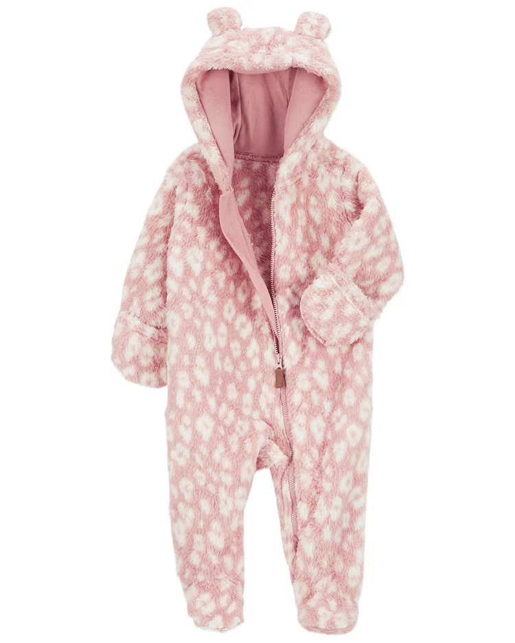 Após um dia de descobertas, o Macacão bebê peluciado com capuz de orelha onça rosa | Carter's aparece para proporcionar conforto e fofura para sua baby. A peça é feita de tecido peluciado sendo ideal para os dias mais frios. Conta com pezinho, capuz, orelhinhas interativas, estampa de onça, além do fechamento por zíper e mangas longas para proteger a sua pequenininha. Aposte!