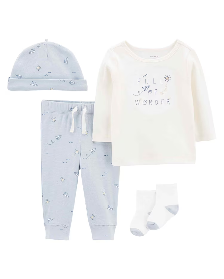 Traga mais fofura e conforto ao seu baby com o Conjunto longo bebê 4 peças avião de papel multicor | Carter's. Feito de algodão, o conjunto possui uma camiseta de manga longa, uma calça com cós de elástico, uma touca com dobra e um par de meias. Um charminho para o seu baby. Aposte!