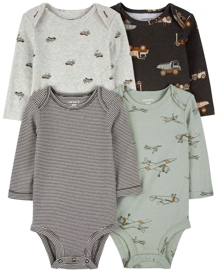 O Kit body bebê 4 peças manga longa aviões e carros multicor | Carter's é confeccionado em malha de ribana e mega confortável. Super prático para ser utilizado no dia a dia do seu pequeno, a peça conta com cores combinam com todos os momentos, contam com estampa de aviões e carros e vão deixar o seu baby ainda mais lindinho. Invista!