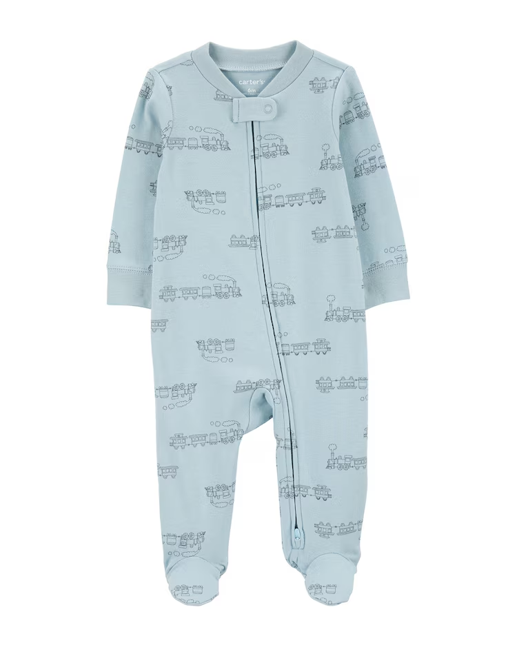 Alie fofura e conforto para sua baby com o Macacão bebê trem azul | Carter's. Feito de algodão, o macacão é perfeito para ser usado em dias frios ou com clima amenos, possui fechamento por zíper inverso, martingale para proteger seus dedinhos, com pezinho e super prático. Ela ficará ainda mais linda com essa estampa de trem. Aposte!