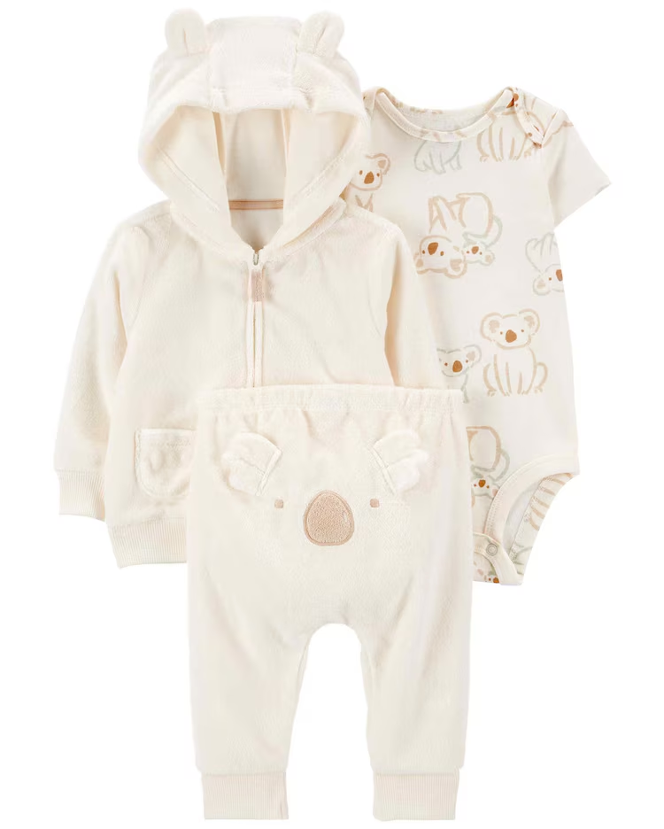 Perfeita para aquecer os pequenos, o Conjunto longo bebê 3 peças capuz coala bege | Carter's traz o conforto e o aconchego tão necessários. Feito de algodão, o conjunto conta com um casaco com capuz, é super estiloso por conta de sua estampa listrado, acompanhado por uma calça com cós de elástico e fecha com um body com estampa de baleia. Aproveite!